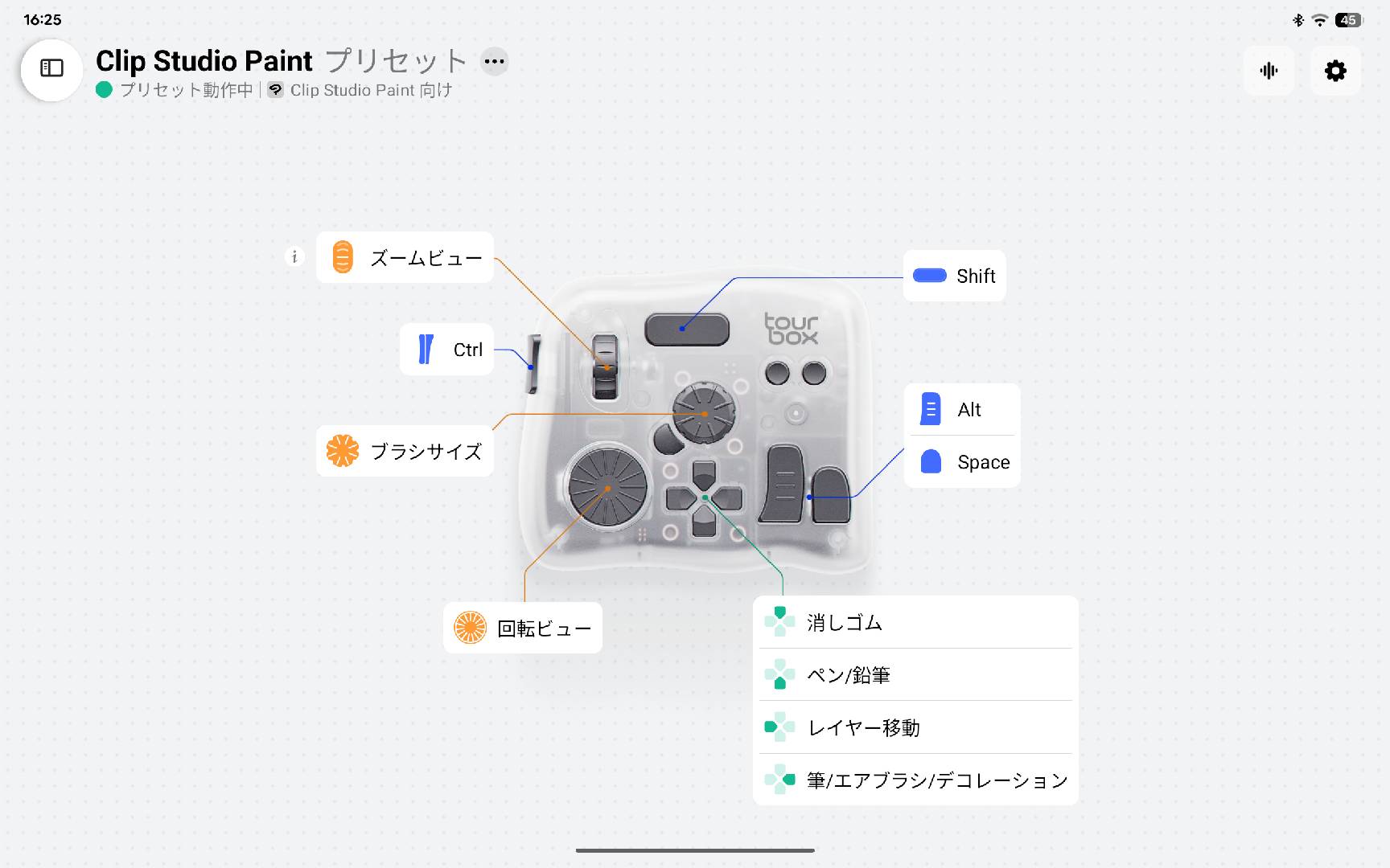 Android版のTourBox Consoleでは人気ペイントアプリ「CLIP STUDIO PAINT(クリスタ)」用のプリセットが内蔵され、プリセットリストから選択、作成できます。クリスタのプリセットではすでに常用の機能を一通り設定しているので、自分で初期設定をしなくてもすぐにクリスタでTourBoxを使えます。もちろんプリセットのカスタムも可能ですので、プリセット内の設定を自分好みで調整するのも問題ありません。