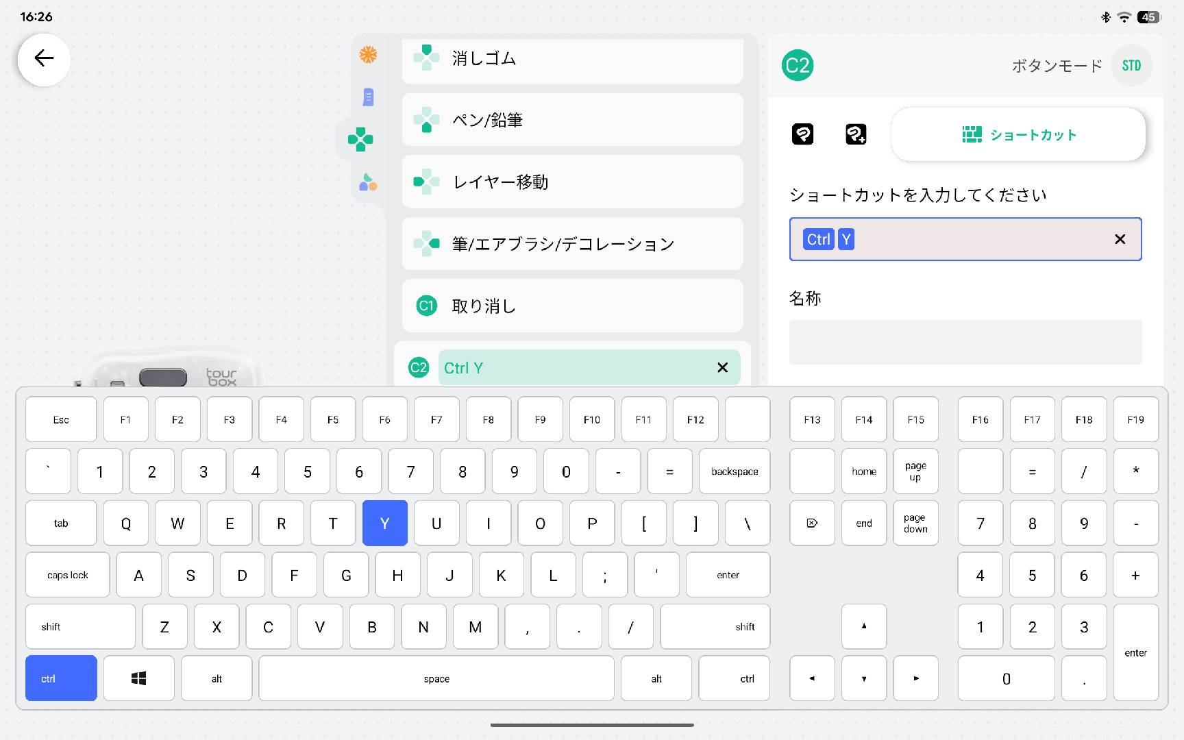Android版TourBox Consoleでは最大10個のプリセットを作成できます。内蔵のクリスタプリセット以外、カスタムプリセットの作成も可能です。事前にPCなどでボタンの割り当てを行う必要がなく、バーチャルキーボードを使って、ボタンにショートカットを設定できます。ボタンの設定は標準モード、UPモード、ABモード、周回モードに対応します。回転操作の速度及び触覚フィードバックの振動強度は3レベル調整可能。
