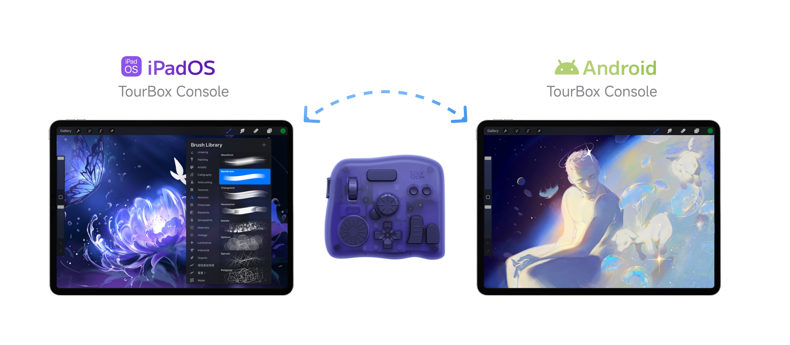 今回のAndroid対応追加はTourBox Elite Plus全カラーバリエーションが対象になります。好評発売中のクリアートランスパレント、それから予約受付中のアークティックシリーズも、Android、iPadOS、Windows、macOSフルーサポート。異なる端末で創作を行う時もシームレスなマルチデバイスワークフローを構築しました。