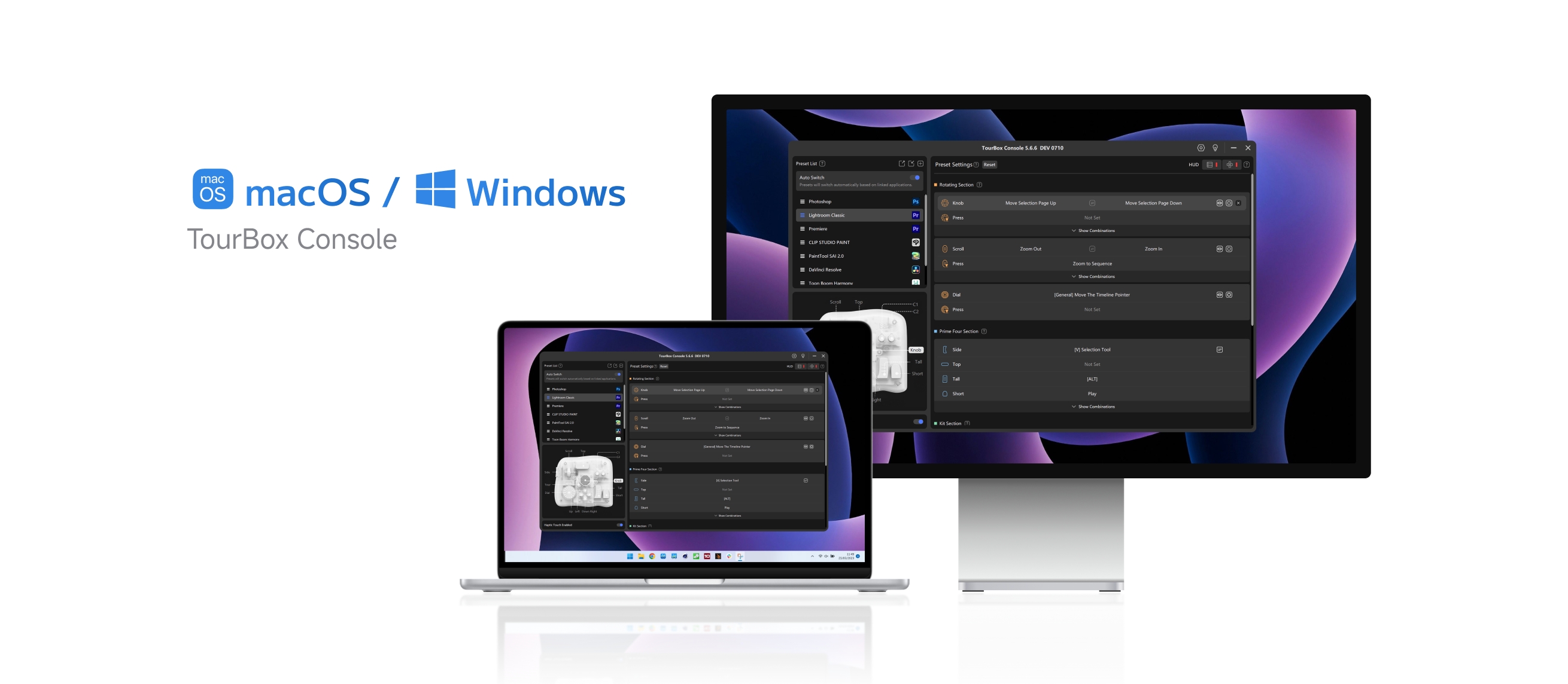 Android版TourBox Consoleのリリースにより、TourBox Elite PlusはWindows、macOS、iPadOS、Android四つの主要クリエイティブプラットフォームを全部対応できるようになりました。どのシステムでも同じようにボタン設定をカスタムでき、異なる端末で一貫した操作を実現します。